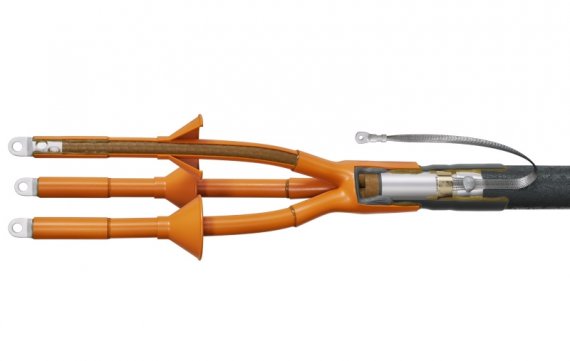Основные термоусаживаемые элементы муфты: перчатка, трубки жильной изоляции, концевые манжеты выполнены из трекингостойкого материала кирпично-красного цвета