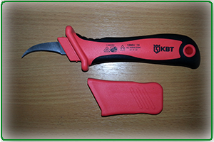 Нож монтерский диэлектрический с изогнутым лезвием НМИ-03 предназначен для резки и разделки кабелей и проводов при работе в электроустановках напряжением до 1000В переменного тока промышленной частоты.