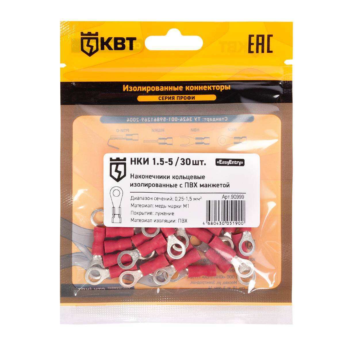 Технические характеристики КВТ Наконечник кабельный кольцевой изолированный НКИ 1.5–5, 90999