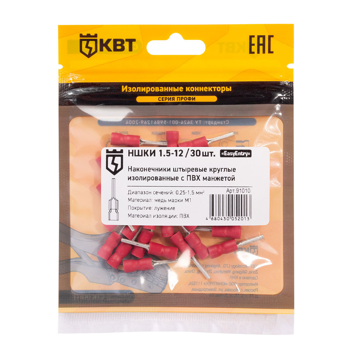 Технические характеристики КВТ Наконечник кабельный штыревой круглый изолированный НШКИ 1.5–12, 91010