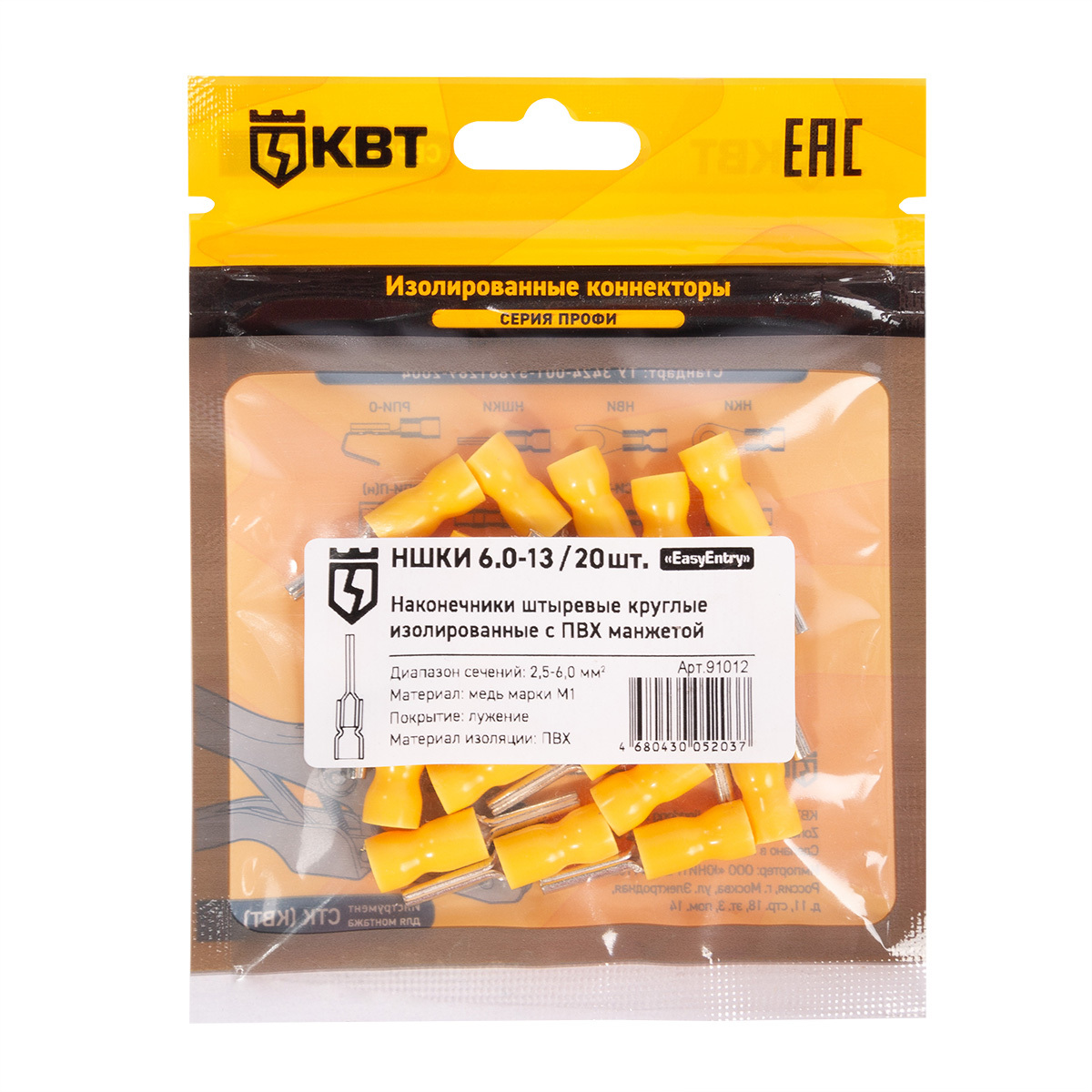 Технические характеристики КВТ Наконечник кабельный штыревой круглый изолированный НШКИ 6.0–13, 91012