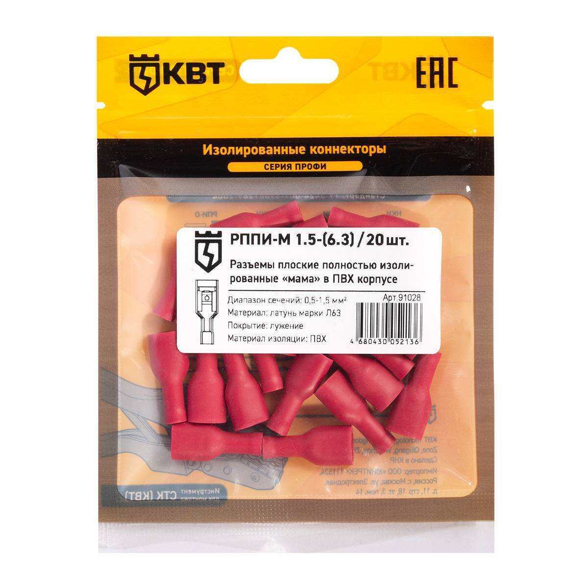 Технические характеристики КВТ Разъем кабельный плоский полностью изолированный «мама» РППИ-М 1.5-(6.3), 91028