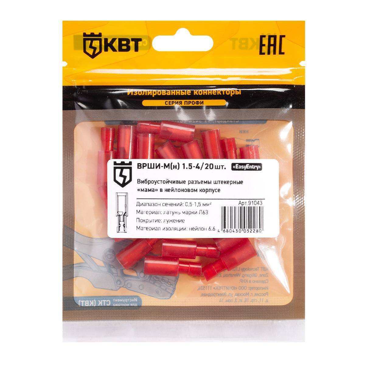 Технические характеристики КВТ Разъем штекерный изолированный «мама» ВРШИ-М(н) 1.5-4, 91043