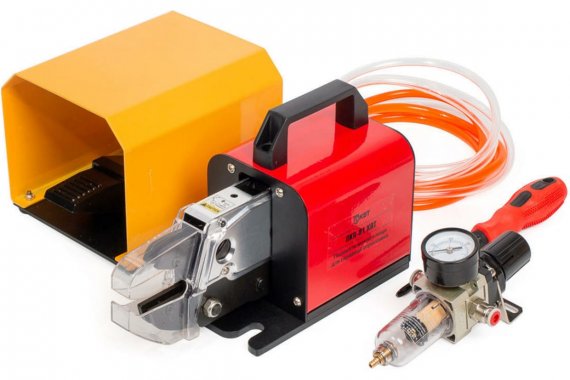 Пневматические пресс-клещи КВТ ПКП-01 85396 предназначены для серийной опрессовки изолированных наконечников, гильз и разъемов, медных трубчатых наконечников, автоклемм и других наконечников в зависимости от выбранной матрицы. Устройство оснащено ножным педальным приводом с регулятором давления, что позволяет настроить необходимые параметры работы. Прозрачный защитный кожух на губках инструмента препятствует попаданию в корпус пыли и влаги. Компактные габариты и удобная рукоятка обеспечивает удобную транспортировку инструмента.
