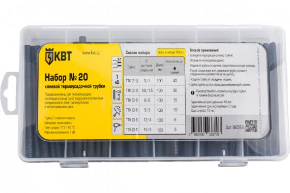 Набор термоусадочных трубок №20 (КВТ) от-55до+125°С Длина 0.1м Номинальный диаметр до/после усадки 3/1 , 4.8/1.5 , 6/2 , 9/3 , 12/4 , 15/5 мм