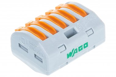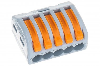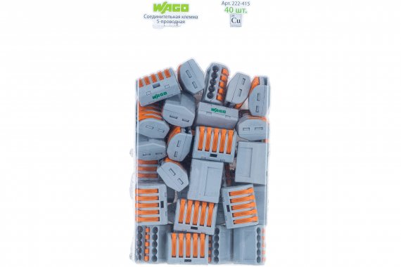 Соединительная клемма WAGO 222-415, с рычажком, 5ти проводная, предназначена для соединения одножильных (и многожильных) медных или алюминиевых проводников с сечением от 0,08 до 4мм². Из-за своей компактности, клеммы можно использовать в ограниченном пространстве. Благодаря прозрачному корпусу, можно контролировать правильно ли лежит проводник, сколько изоляции нужно снять. Каждый проводник имеет отдельное клеммное место и не повреждается в результате монтажа. Проводящая часть соединителя изготовлена из меди, корпус из пластика. Монтаж не требует использования инструментов. Рычажки помогают надежно закрепить кабель.