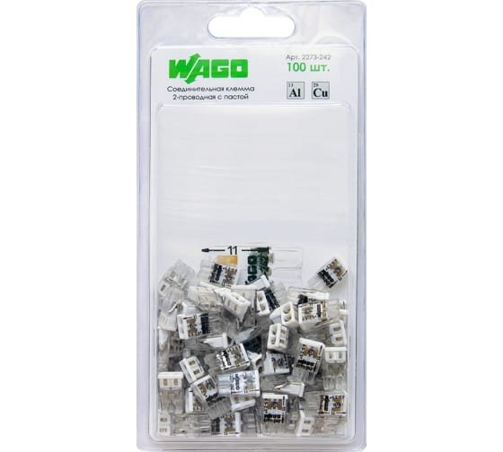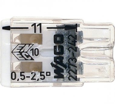 Миниатюрные клеммы Wago серии 2273 (с контактной пастой) предназначены для подключения алюминиевых и медных проводников. Контактная паста снимает окисную пленку с алюминиевых проводов и предохраняет их от повторного окисления. Надежное подключение одножильных/многожильных медных проводников (до 3-го класса гибкости), алюминиевых проводников, а также смешанный электромонтаж. При монтаже многожильных гибких проводов конец многожильного провода предварительно необходимо обжать при помощи втулочных наконечников. Конструкция клемм предусматривает возможность монтажа проводников различного сечения (0,5 до 2,5) в одной клемме. Линейное расположение контактной группы экономит место в распределительной коробке, а также делает монтаж более удобным и быстрым. Каждый проводник имеет отдельное клеммное место и не повреждается в результате монтажа. Смотровые окна на корпусе клеммы дают возможность контролировать правильность зачистки проводников и защиту от касаний. Конструкция корпуса клемм предусматривает тестовые гнёзда под все стандарты измерительных щупов. Уникальная цветовая маркировка каждого типоразмера клемм позволяет быстро и правильно идентифицировать их при монтаже. Возможность визуально определить сечение проводника и необходимую длину зачистки с помощью информации нанесенной на корпус клеммы. Монтаж не требует использования инструментов. Прозрачный корпус позволяет контролировать глубину захода жилы. Надежная защита от случайного прикосновения к токоведущим частям соединения. Гарантированная надежность контактов, исключающая короткое замыкание и разогрев в точке соединения.