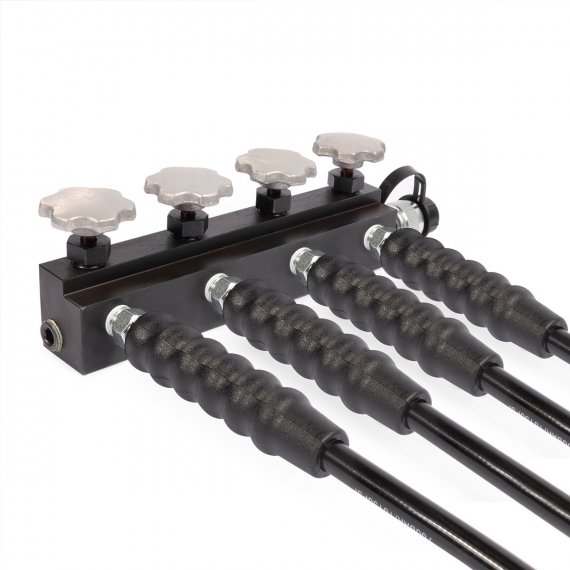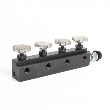 Кран гидравлический распределительный 4-канальный модель: КГР-4 Возможность подсоединения нескольких гидравлических устройств к одной помпе с одновременнойили попеременной подачей рабочей жидкости