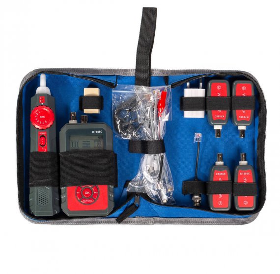 - Тестер для поиска и трассировки сетевого и электрического кабеля, измерения длины сетевых кабелей CAT 5, CAT 6, BNC, проверки витых пар и телефонных линий, визуализации места повреждения оптоволоконных кабелей